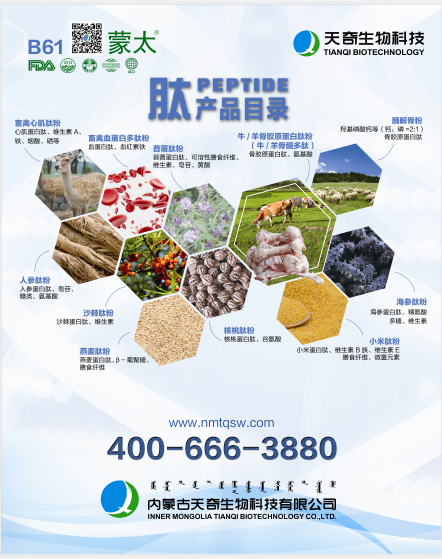 內蒙古天奇生物科技有限公司,組建于2004年,為內蒙古天奇蒙藥集團核心子公司,坐落于美麗的草原明珠——赤峰市。公司依托獨特的地理位置與豐富的動植物資源,利用先進的設備與工藝,堅持“骨肽,我們只做鮮的”產(chǎn)品定位,專注于各類肽原料的生產(chǎn),加工,定制,銷售。目前公司自主品牌蒙太®旗下已有畜源肽,植物肽等多個品類,十余種產(chǎn)品,在本次會議都將與大家見面。