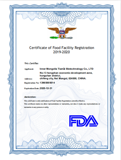 熱烈慶祝天奇生物天奇生物HACCP認(rèn)證、ISO22000體系認(rèn)證、FDA認(rèn)證復(fù)審成功。天奇生物作為集多肽食品原料、現(xiàn)代食品和保健食品研發(fā)、生產(chǎn)和銷售為一體的現(xiàn)代化企業(yè),對生產(chǎn)食品安全衛(wèi)生質(zhì)量控制、建立關(guān)鍵控制點對危害進(jìn)行控制,消除食品安全危害,確保食品在消費的生產(chǎn)、加工、制造、準(zhǔn)備和食用等過程中的安全等方面一直不懈努力并獲得中國質(zhì)量認(rèn)證中心的全面肯定。不僅致力于國內(nèi)大健康產(chǎn)業(yè)的拓展和銷售,同時積極開拓海外市場獲得FDA認(rèn)證,這也標(biāo)志著天奇生物相關(guān)產(chǎn)品被相關(guān)部門認(rèn)定,確保食品供應(yīng)安全、干凈、新鮮并且標(biāo)識清楚。注:(天奇生物自成立不久便獲得相關(guān)資質(zhì)認(rèn)證,此次為復(fù)審。)